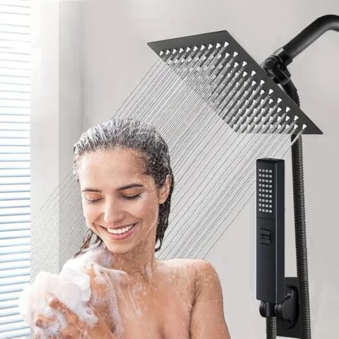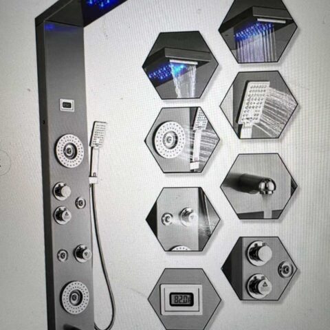 LED Shower Column with Massager, Shower Panel with LCD Display, Temperature Display, Rain, Waterfall, Massage Jets, Handheld Shower and Bathtub Spout, Stainless Steel, Black