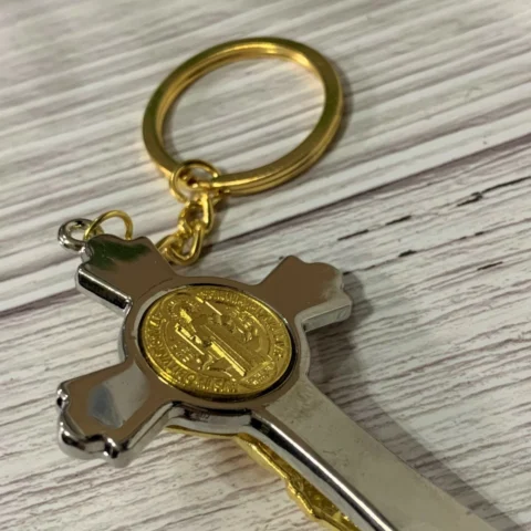 St Benoit Cross Keychain – Gold Stainless Steel Rotating Keyring